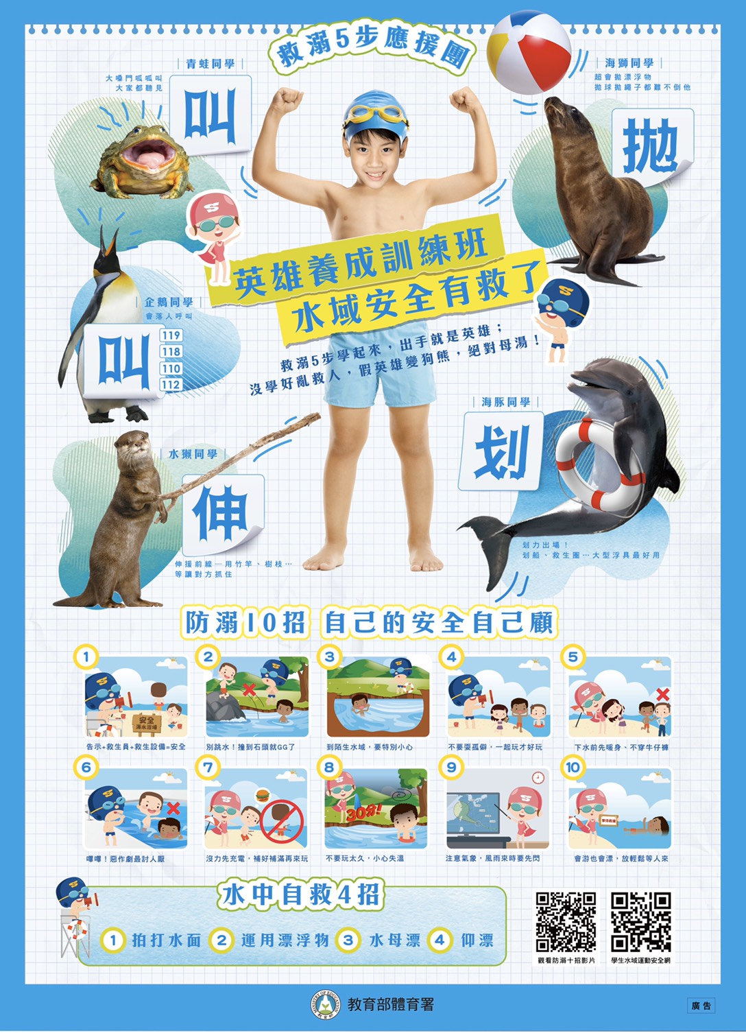2.適逢雨季,且偶有午後強降雨的情形,考量學生(家庭)於放假期間,參與戲水、露營、健行或水域遊憩(含游泳、衝浪、潛水、獨木舟等)等活動可能性高,請務必落實水域及遊憩安全宣導,且應穿著救生衣並選擇合法承辦單位及合法水域場所。